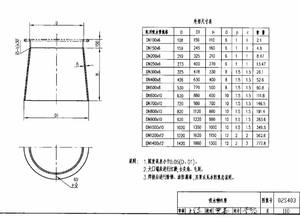 比如說60度45度,再往下呢就是有一個90度鍵縮異徑彎頭尺寸的,跟上面的東西都一樣的一個圖表,反正他這些別管三通也好還是說偏心異徑管等等的也好,基本上都是按照這個意思來的,后是吸水喇叭口吸水,喇叭口在他的112頁,然后我們再說他這個總說明是什么意思就是說這個圖集是根據建設`部1999年的202號的文件,并且在1975年編制的S311鋼制管道零件這樣的一個圖集上,這樣的一個基礎上修整完成的,這就是說這個鋼制管件它的一個前身的基礎是什么?